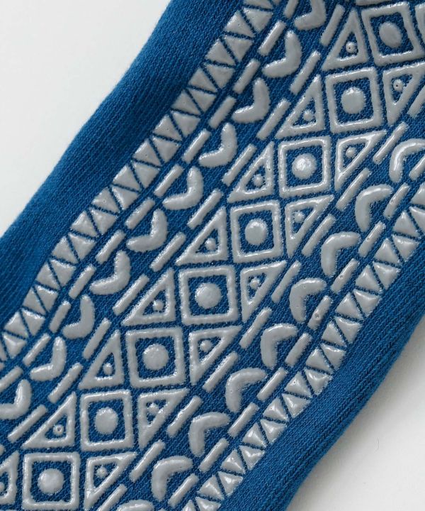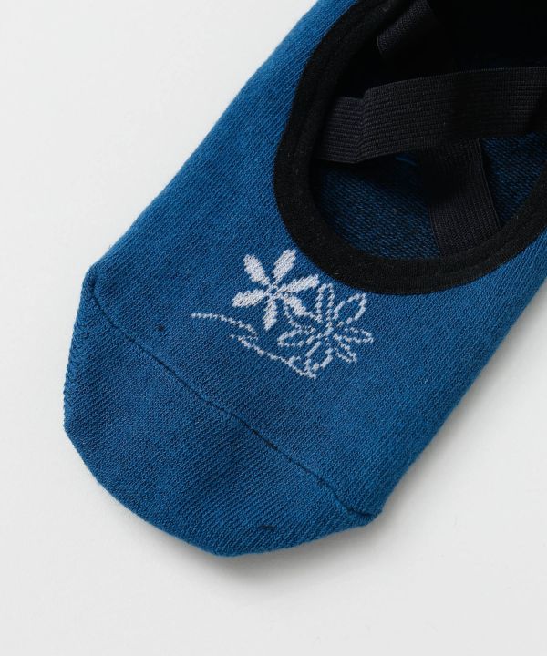 足元を華やかに彩るオリジナル刺しゅう入りレッスンソックス。クロスゴム仕様で脱げにくく、裏面の滑り止めが安定した動きをサポート。幾何学模様のソールデザインと豊富なカラーバリエーションで、フラや室内練習をおしゃれに楽しめます。