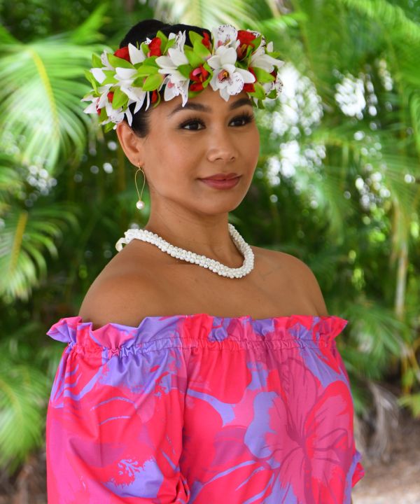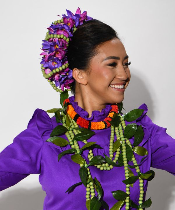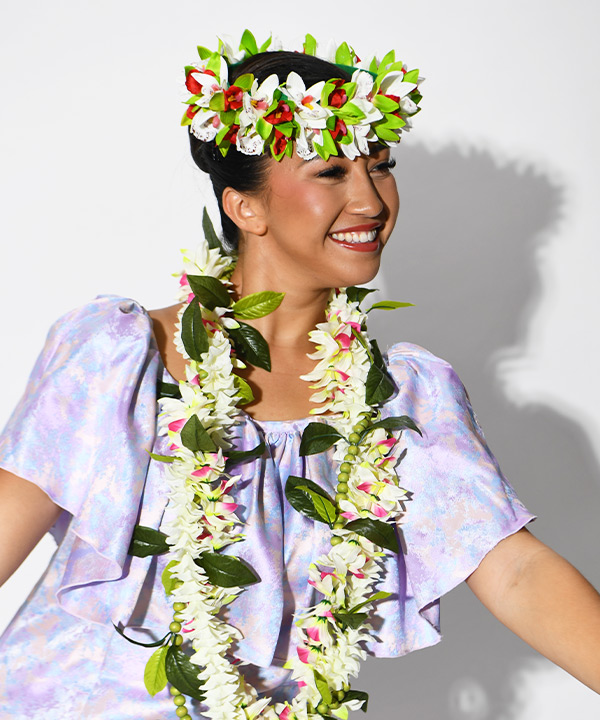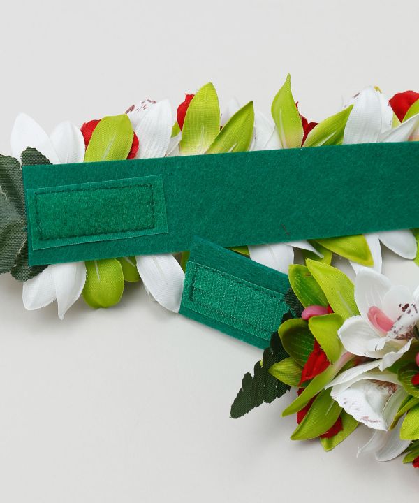 色とりどりのオーキッドを繊細にあしらった華やかなハクレイ。サイズ調整が可能で頭まわりにしっかりとフィットし、踊りの動きにもずれにくい仕様。フラの装いを華やかに仕上げる、存在感あるステージアクセサリーです。