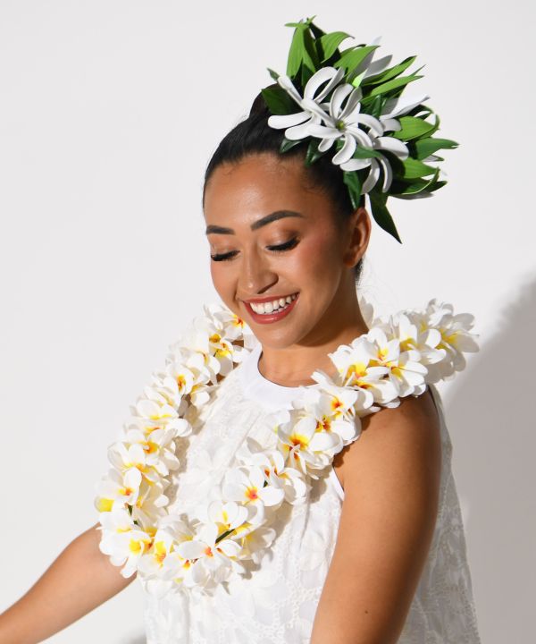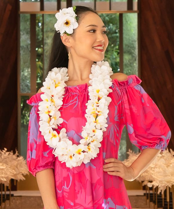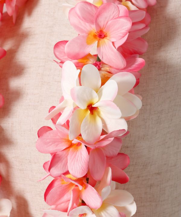立体感のあるプルメリアをふんだんにあしらったボリュームレイ。遠くからでも目を引く華やかさで、ステージの表情を一層豊かに演出します。