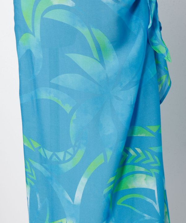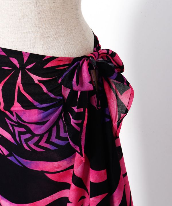 ティアレとトライバルモチーフが調和した力強く華やかなデザインのパレオスカート。結ぶだけで美しく着こなせ、丈調整も自在。スカートやワンピースとしても着回せる多機能デザインで、早着替えやレッスン、移動時にも重宝するアイテムです。