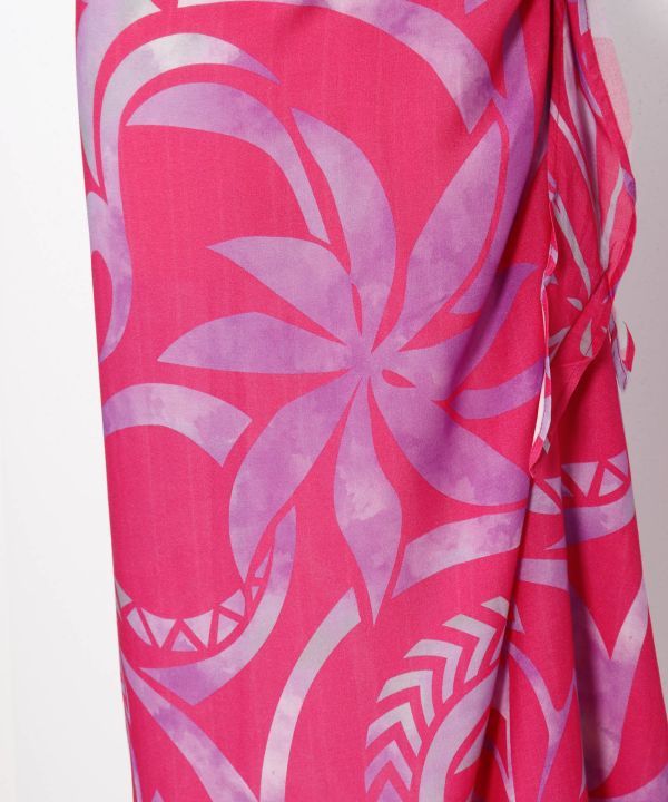 ティアレとトライバルモチーフが調和した力強く華やかなデザインのパレオスカート。結ぶだけで美しく着こなせ、丈調整も自在。スカートやワンピースとしても着回せる多機能デザインで、早着替えやレッスン、移動時にも重宝するアイテムです。