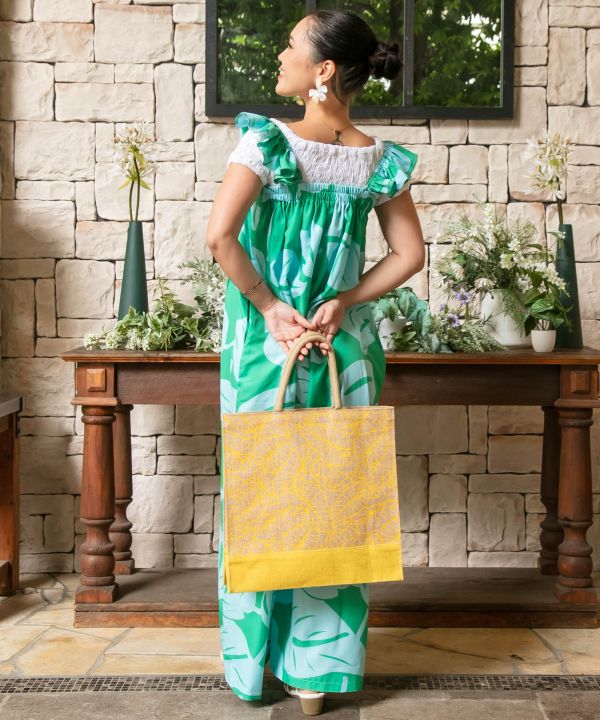 タロリーフ柄がナチュラルな風合いを引き立てるジュート素材のトートバッグ。しっかりとしたマチ付きで収納力があり、レッスンやお出かけ、エコバッグとしても活躍。クッション性のある持ち手で手に優しく、使い勝手の良さも魅力です。