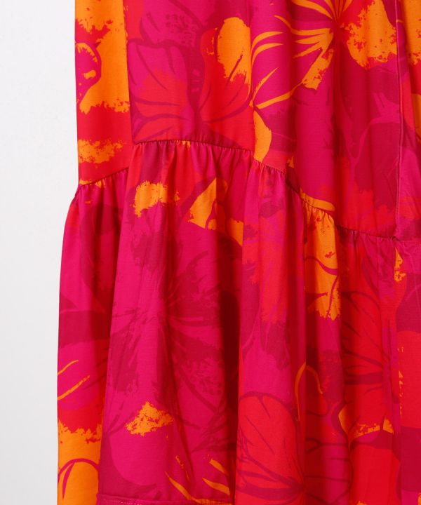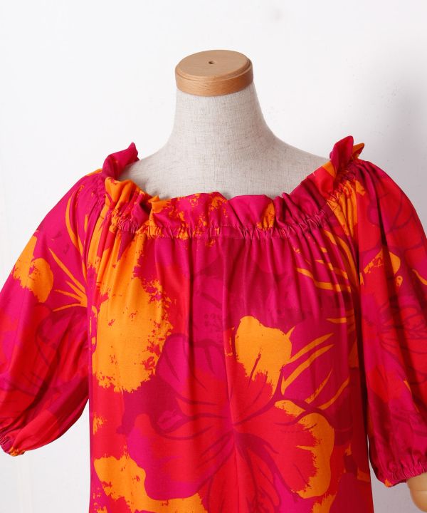 ビビッドカラーを効かせたダイナミックなハイビスカス(アロアロ)のアートワーク。幾重にも重ねた奥深い色層がポリネシアンムードを際立たせます。ヴィンテージ・ムウムウを想わせるノスタルジックさとトレンド感をミックスしたデザインに仕上げました。