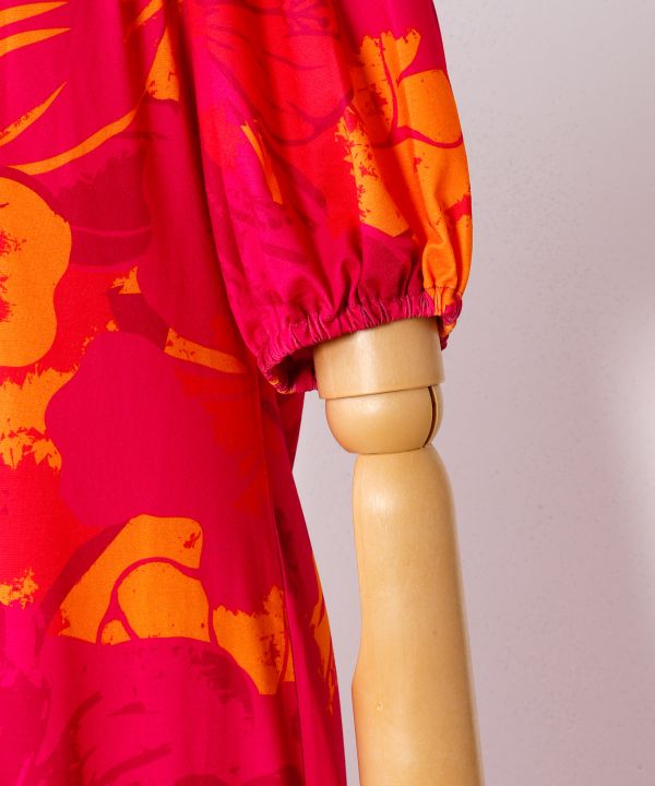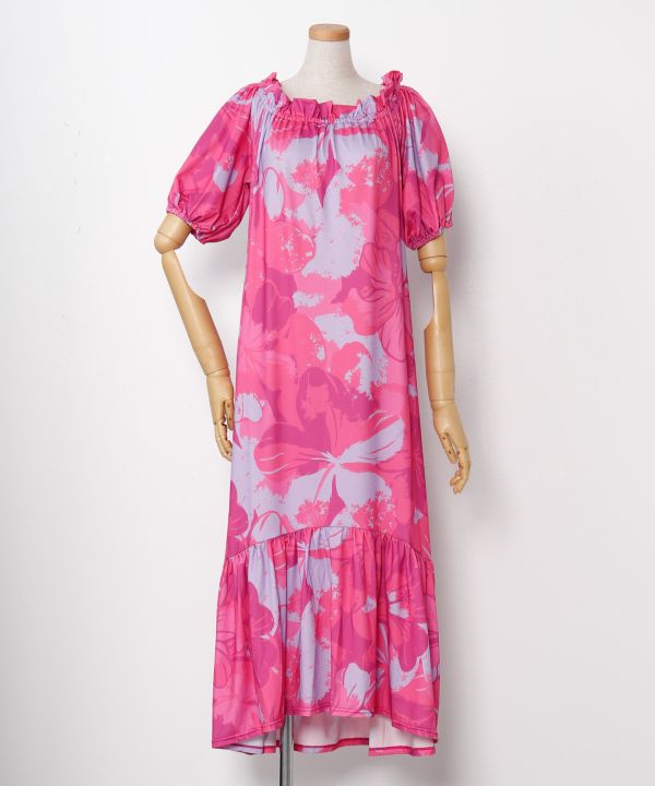 ビビッドカラーを効かせたダイナミックなハイビスカス(アロアロ)のアートワーク。幾重にも重ねた奥深い色層がポリネシアンムードを際立たせます。ヴィンテージ・ムウムウを想わせるノスタルジックさとトレンド感をミックスしたデザインに仕上げました。