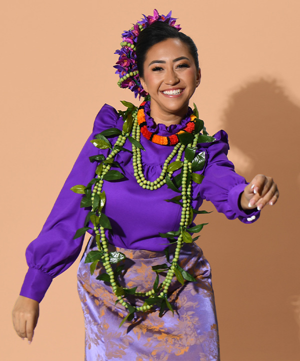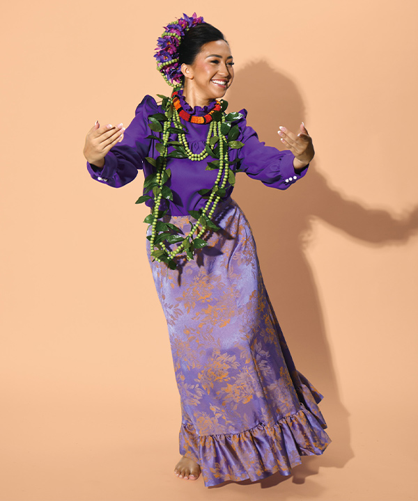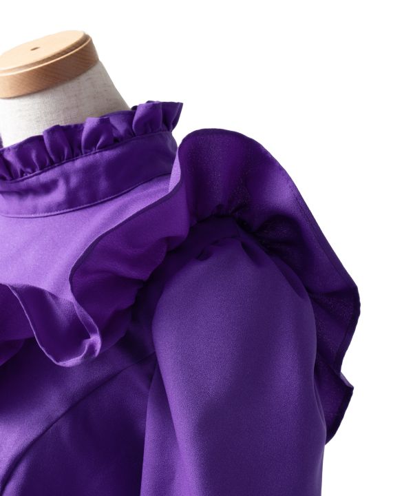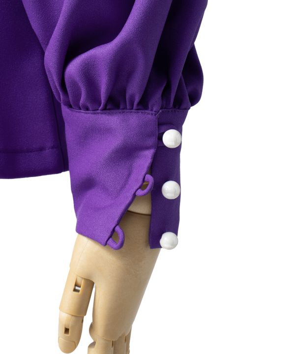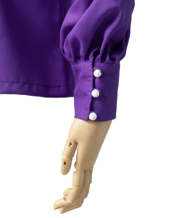 ステージにクラシカルな雰囲気を醸し出すロイヤルスタイルのブラウス。フリルをあしらったカラーと胸元、ゆったりとした袖のシルエットと袖口カフスのパールボタンがエレガントでクラス感あふれる衣装に。こちらのサンプルではアムンゼンを使用。しなやかな着心地です。※背面はコンシールファスナーです。