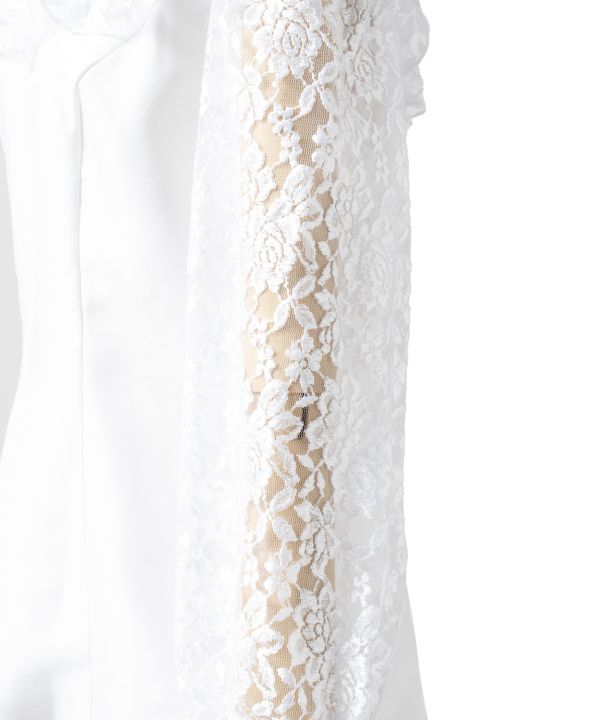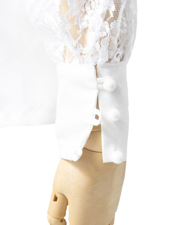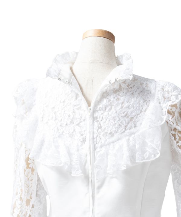 ステージにクラシカルな雰囲気を醸し出すロイヤルスタイルのブラウス。フリルをあしらったカラーと胸元、ゆったりとした袖のシルエットと袖口カフスのパールボタンがエレガントでクラス感あふれる衣装に。シャンタンとレースの組み合わせでより高級感を与えました。後ろファスナーはフルオープン仕様のためヘアメイク後でも被らずに着脱が可能です。