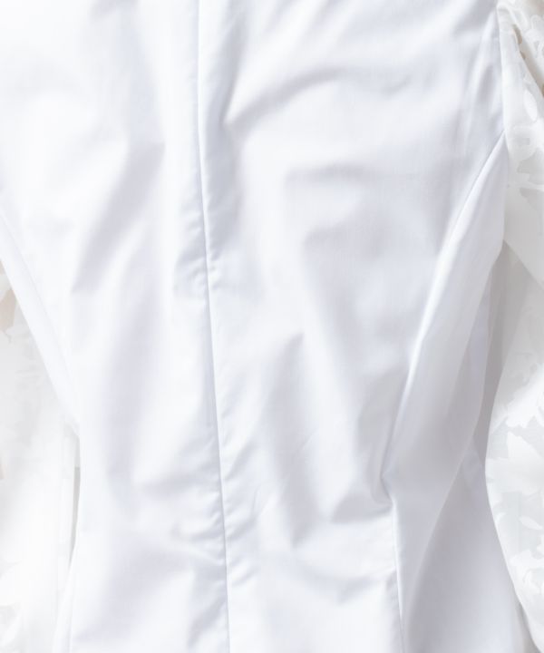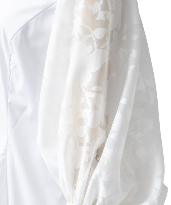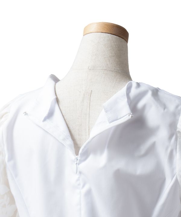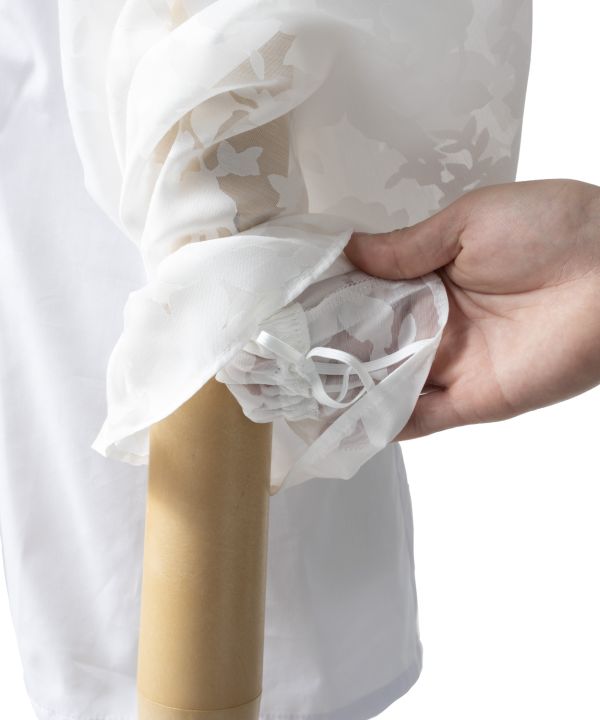 贅沢なボリュームの袖が特徴的なバルーンスリーブブラウス。レイに合わせやすいようにネック周りと身頃はすっきりシンプルにしつつ、袖山からお袖はふんわりとエレガントに仕上げました。袖口は調整可能なゴム入り。お好きな位置で調整でき、また袖口部分を内側に織り込むアレンジも可能です。※背面はコンシールファスナーです。 こちらのサンプルでは袖部分にレースなど透け感のある生地をお選びいただけます。