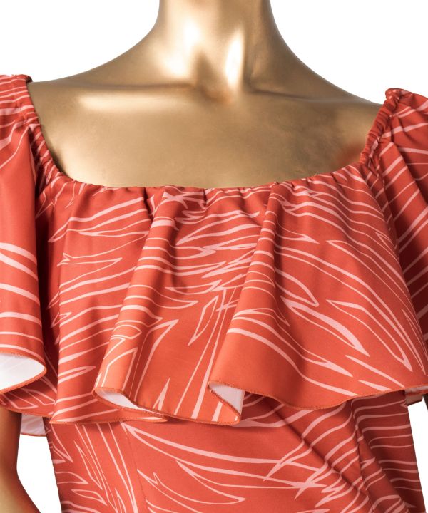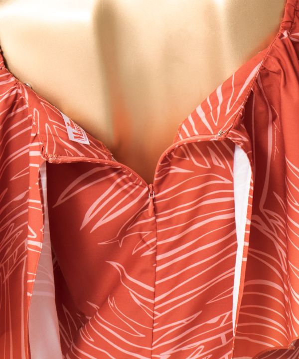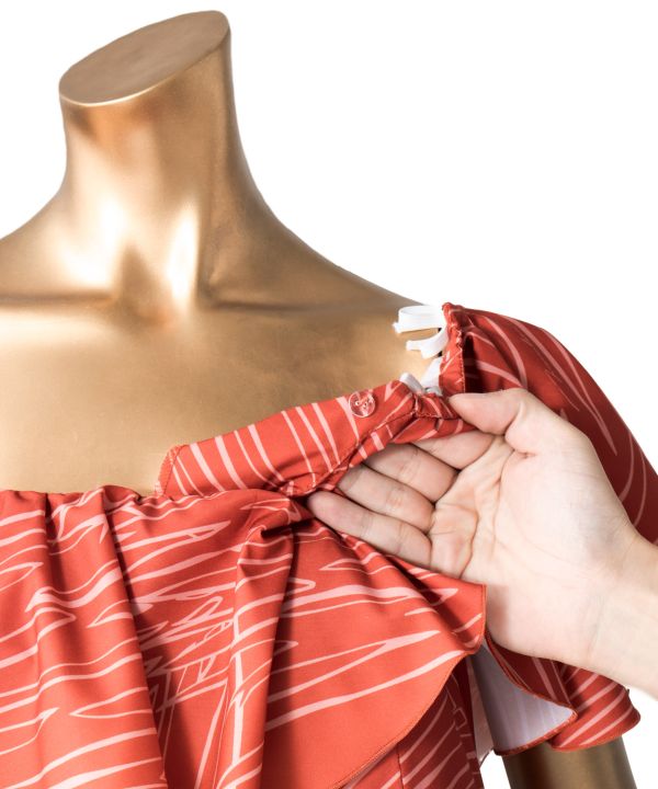 大きな衿と裾のバランスが美しいデザイン。ボリュームのある切替え下からのシルエットは前後差もあり、踊った姿がエレガント。身頃もタイトめのスタイルで、メリハリがあり、印象的なスタイルに仕上がっています。透明のショルダーストラップ付きなので、オフショルダーがずり上がることもありません。(ショルダーストラップは調整できません)