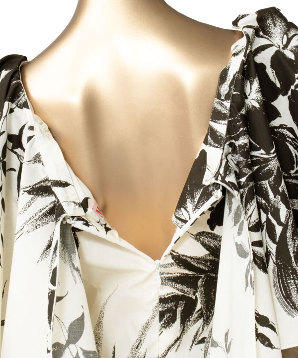 たっぷりと長めにお作りした後ろ下がりの胸フリルが踊った際に流れるようなシルエットを演出します。 フリルはボタンで取り外しが可能でノースリーブドレスとしてもお召しいただけます。揺れ感のある縦の切替えに裾のフリルで華やかさを加えました。
