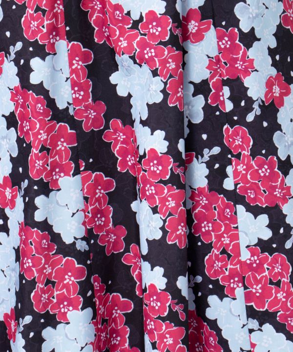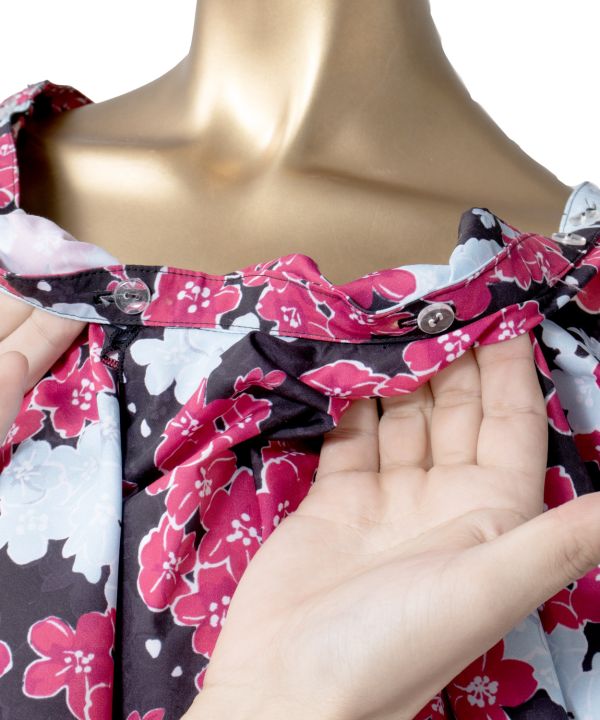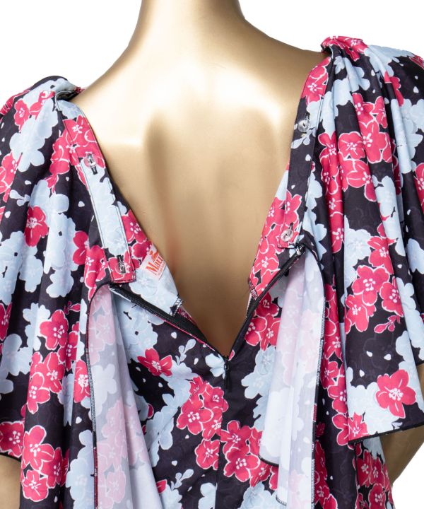 たっぷりと長めにお作りした後ろ下がりの胸フリルが踊った際に流れるようなシルエットを演出します。 フリルはボタンで取り外しが可能でノースリーブドレスとしてもお召しいただけます。 揺れ感のある縦の切替えに裾のフリルで華やかさを加えました。
