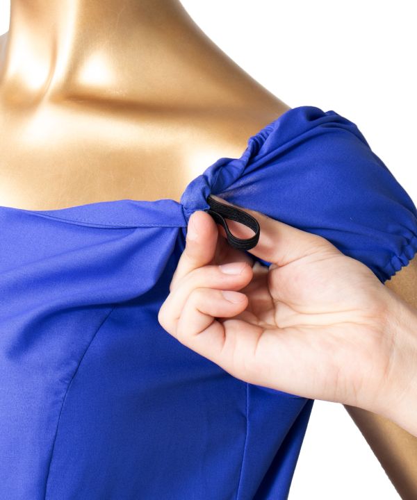 コンパクトな上身頃とふんわりスカートが美しいシルエットのドレス。パフ袖からの流れるようなデコルテラインや背中の程よい開きがエレガント。ウェスト部分のギャザー切替えから広がるボリュームたっぷりのスカートがフラドレスらしい1着です。
