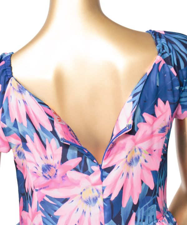 コンパクトな上身頃とふんわりスカートが美しいシルエットのドレス。パフ袖からの流れるようなデコルテラインや背中の程よい開きがエレガント。ウェスト部分のギャザー切替えから広がるボリュームたっぷりのスカートがフラドレスらしい1着です。