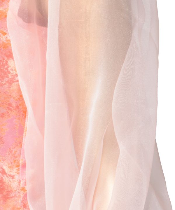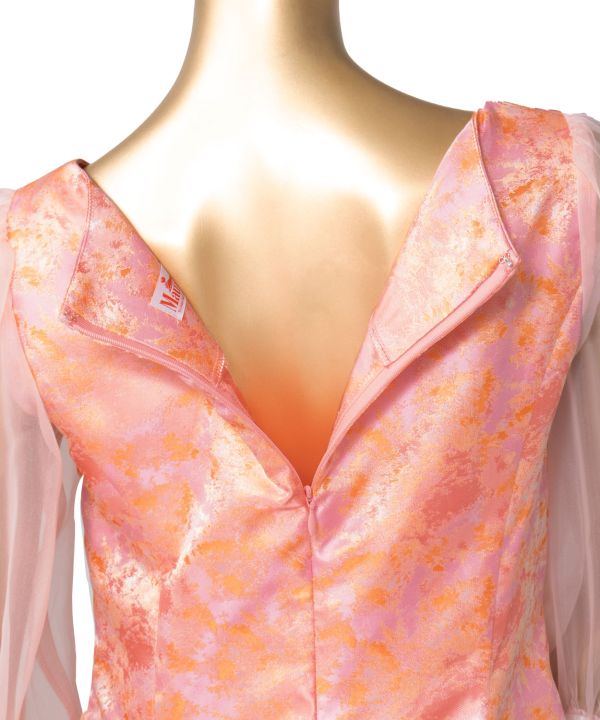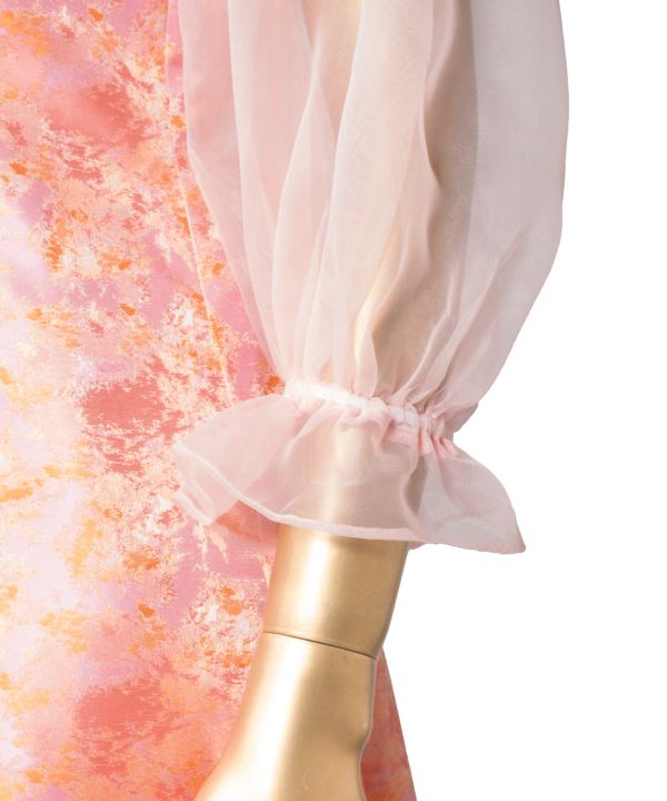 ふんわりとした膨らみのある袖山から流れるバルーン袖のシルエットが優美な印象のドレス。首から背中の開きが小さく、落ち着いた印象でお召しいただきやすいデザインです。動きやすく揺れ感が美しく出る縦の切替え。袖口は調整可能なゴム仕様なので、お好みのギャザー感でお使いいただけます。