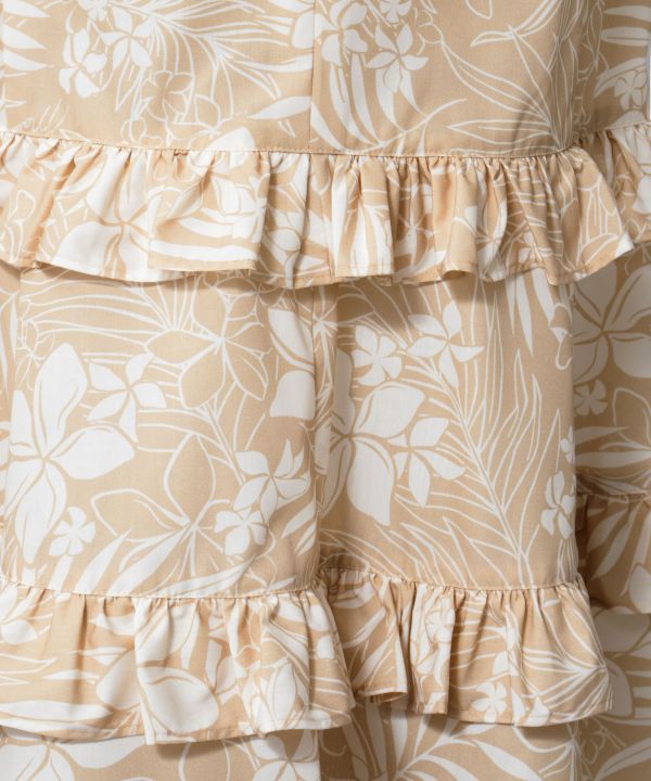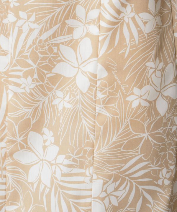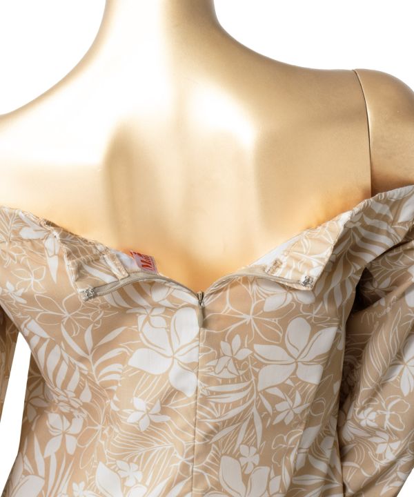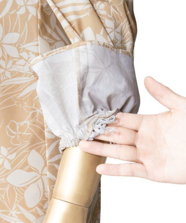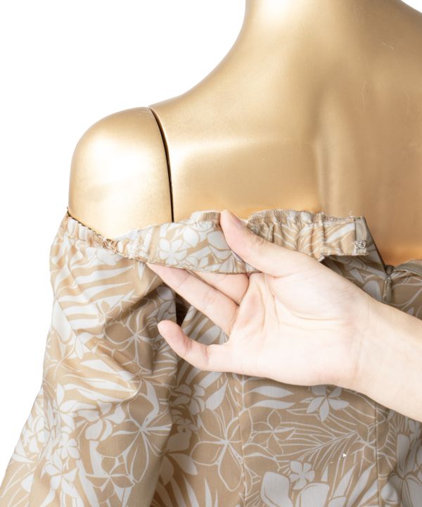 広くあいたデコルテラインとゆったりとしたお袖、スカートのたたきつけフリルなど、ビンテージの空気を纏いつつトレンドを取り入れたデザイン。肩や背面上端の調整ゴムでシルエットアレンジも可能です。さらに袖口ゴムも調整可能、ストラップ受けも付けました。こちらのサンプルでは全てのパーツをハワイアンファブリックで仕立てました。その他カラーブロードもお選びいただけます。