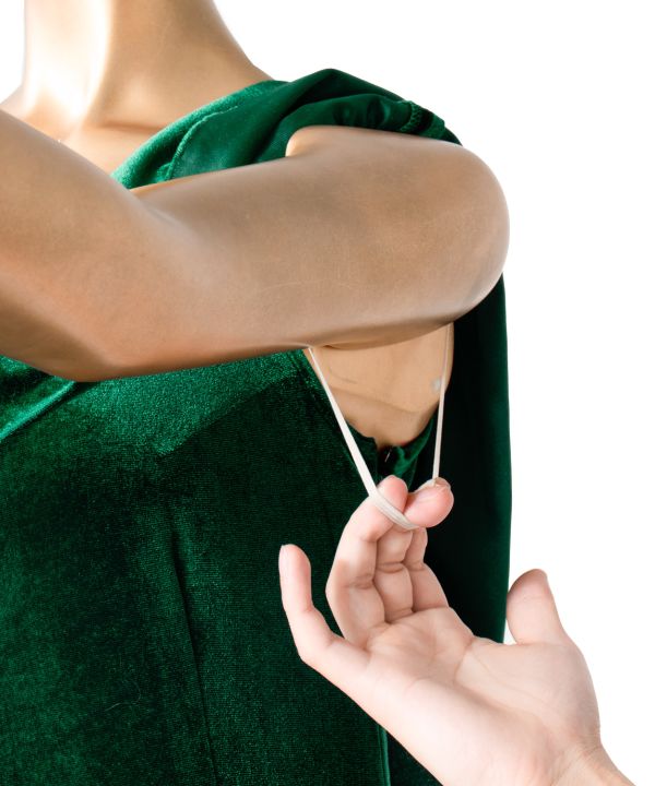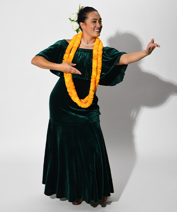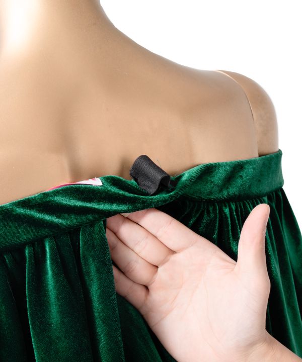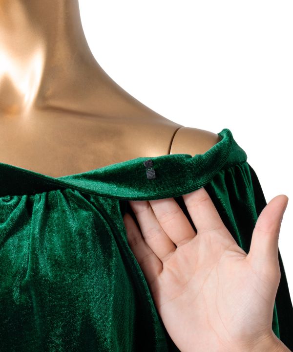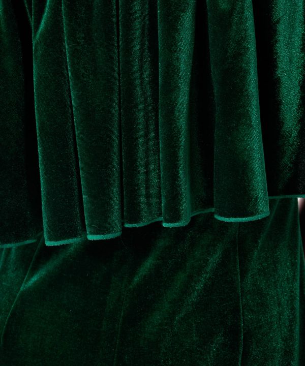 人気のオフショルダーで落ち感のある美スタイルに仕上がるデザイン。長めのフリルと膝位置の切替え下のフレアにたっぷりのボリュームを与え、クラス感のあるシルエットに。衿ぐりのゴム調整ができるほか、腕を挙げた際にずり上がりにくいストッパーゴムつき。身頃の切替えを最小限に抑え、ドレスの滑らかな表情を最大限にお楽しみいただける仕様です。 こちらのサンプルでは艶めく輝きのクリスタルストレッチベロアを使用。伸縮性に富み着心地のよい仕上がりです。
