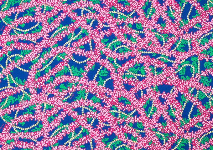 彩り豊かなフラドレスの定番ファブリック。本場ハワイ直輸入の生地はもちろん、マウナロアオリジナルデザインの生地を豊富にご用意しております。 プルメリアとピカケのレイをいくつも重ねて奥行きのあるデザインにしました。途切れることのない美しい色のレイのデザインが可憐に魅せてくれます。
